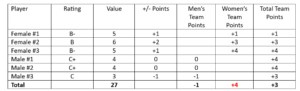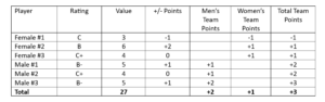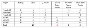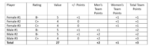 Example 3: Ineligible Team due to men’s pointsFemale Player 1: B- = 5 points which is +1